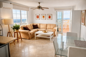 The living room consists of a large sofa, TV with all European channels (also all UK channels), coffee and side tables, decorative lamp, etc.